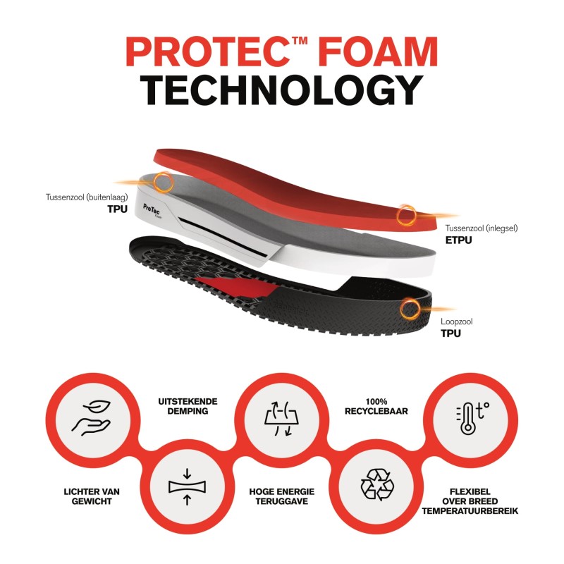De zool van ProTec™ Foam is opgebouwd uit een sterke, slijtvaste buitenlaag, met een flexibele vulling van ETPU. Deze unieke constructie biedt jou enorm veel demping. Bij elke stap die je zet, veert het materiaal terug. Dankzij deze energieteruggave schiet je als het ware over de werkvloer. Extra fijn als je op een werkdag flink wat kilometers maakt. En dat alles zonder het slijtvaste vermogen van de materialen te verliezen.